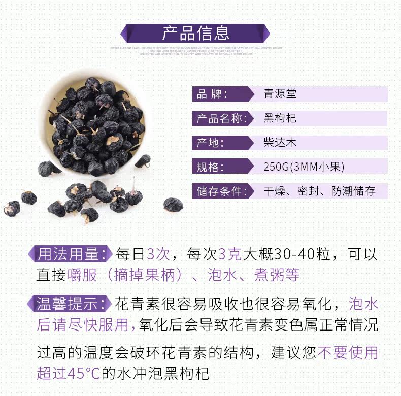 东西收到了 快递十分快东西查过了是正品 而且自己也泡水试过有拉丝现象 (记住是常温水哦)加酸变红哦 下面介绍一下黑枸杞功效吧 (不懂的可以留言问我)传统医学关于黑枸杞的功效论述:黑枸杞能滋补肝肾、益精明目、适用于腰膝酸软、头晕目眩、两眼昏花等症状,藏医药经典《四部医典》、《晶珠本草》等记载黑果枸杞主治心热病、心脏病、月经不调、停经等。《维吾尔药志》记载维吾尔医常用黑果枸杞果实及根皮治疗尿道结石、癣疥、齿龈出血等症,民间作滋补强壮以及降压药。现代科学研究证实了上述说法,并且认为黑果枸杞可以降低胆固醇,兴奋大脑神经,增强免疫功能,防治癌症,抗衰老和美容,黑果枸杞提取物可促进细胞免疫功能,增强淋巴细胞增殖及肿瘤坏死因子的生成,对白细胞介素Ⅱ有双向调解作用,能缓解糖尿病患者多饮多食、体重减轻症。 现代医学关于黑枸杞功效的论述:经科学测定黑果枸杞所含维生素和脂肪远高于红果枸杞。钙、镁、铜、锌、锰、铁、铅、镍、镉、钴、铬、钾、钠各元素对维持人体正常的生理作用具有重要作用,与红枸杞相比,黑枸杞中的铁、钙、镁、锌、铜的含量远高于其平均含量,钾、锰的含量远低于其平均值,钠含量与其基本相当。